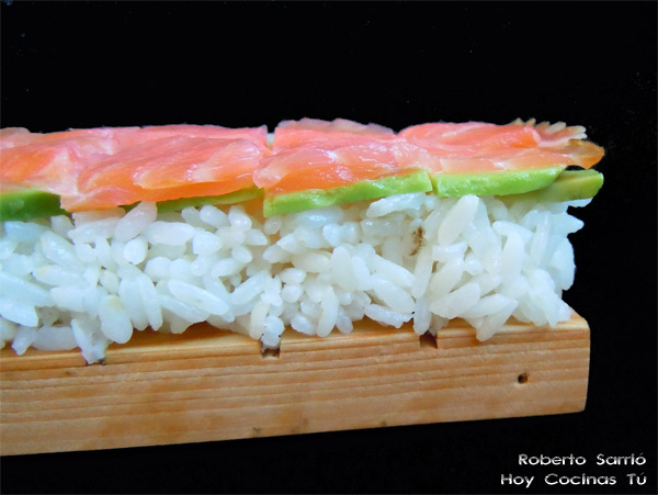 Cubrir la base de la prensa con láminas de salmón, a continuación con el aguacate y para finalizar, distribuir el arroz uniformemente. Poner la tapa de la prensa, y presionar con fuerza para compactar el arroz.
