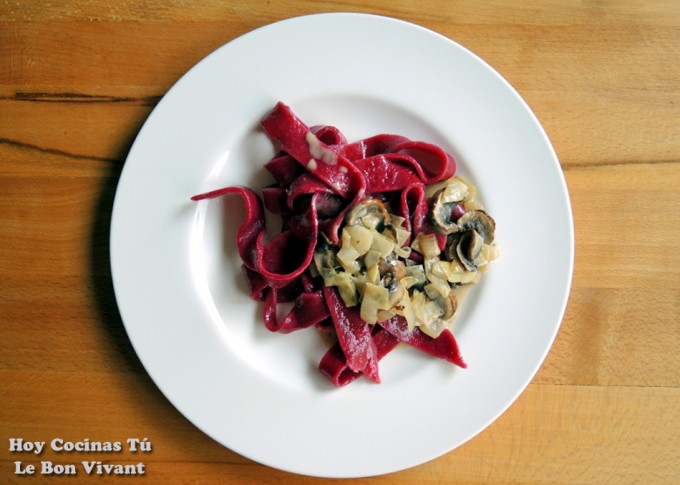 Servimos la pasta de remolacha en el plato y vertemos la crema de champiñones calentita por encima. ¡Buen provecho!