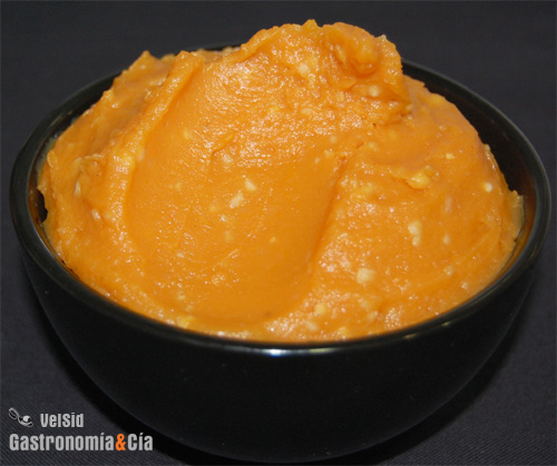 El día anterior empezamos haciendo el dulce de boniato. Los boniatos los asamos en el horno, los pelamos, los trituramos y reservamos. Ponemos el agua a cocer y añadimos el azúcar, hacemos un almíbar que esté un tanto espesito.