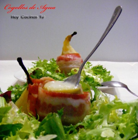 Una vez cocidas las peras, retirar del líquido y esperar a que enfríen. Cortar la parte superior de la pera, justo donde empieza a cambiar de forma, y con cuidado y un sacabolas vaciar el interior. Rellenamos con un trocito de queso gorgonzola tapamos con el copete de la pera y envolvemos con la loncha de beicon.
