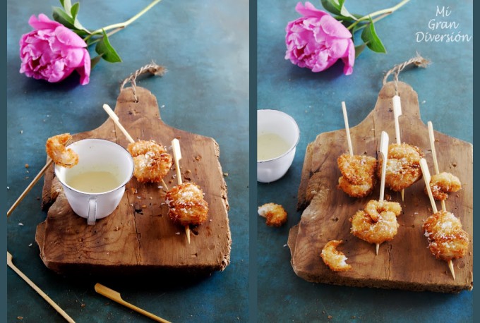 Dolores denomina piruleta a lo que son unas brochetas de langostinos rebozadas y aromatizadas con jengibre y coco, podemos hacer el rebozado con pan rallado, con panko o con pan cracker, cada ingrediente proporciona una textura más o menos crujiente. La salsa con la que se acompañan estos langostinos también es sencilla de preparar, tomad nota de la receta a continuación.