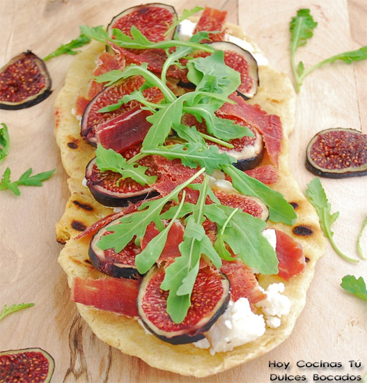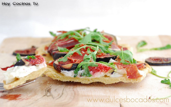 Colocar la masa sobre un plato y rellenar, poner el queso desmenuzado, los higos cortados en rodajas, repartir el jamón troceado y colocar por encima la rúcula.