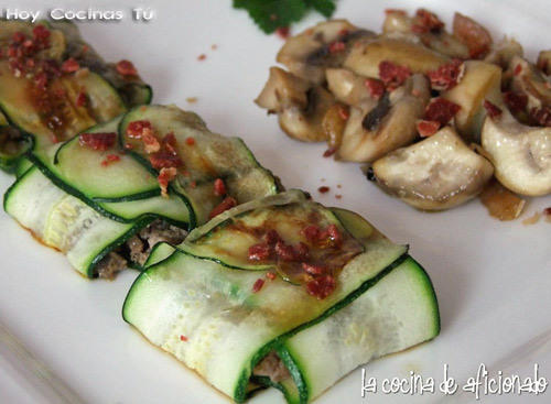 «Es un plato bastante típico el calabacín relleno de carne picada, sin embargo en esta ocasión partiendo de estos mismos ingredientes y añadiendo un poco de foie para realzar el sabor he intentado hacer un plato diferente, sobre todo en su presentación. Quizás el inconveniente sea que para cortar finas láminas de calabacín necesitaremos una mandolina o un cortafiambres. En mi caso lo he hecho con esto último. Los he acompañado de unos champiñones al ajillo y he aprovechado el tocino que le he quitado al jamón a la hora de saltearlos. Por último, en lugar de sal he espolvoreado con crujiente de jamón».