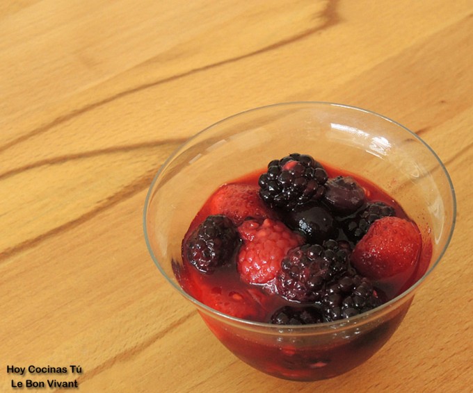 En una olla cocer unos minutos el jugo y verterlo sobre las frutas. Calentar suavemente todo unos 2 minutos más, pero sin que llegue en ningún momento a cocer.