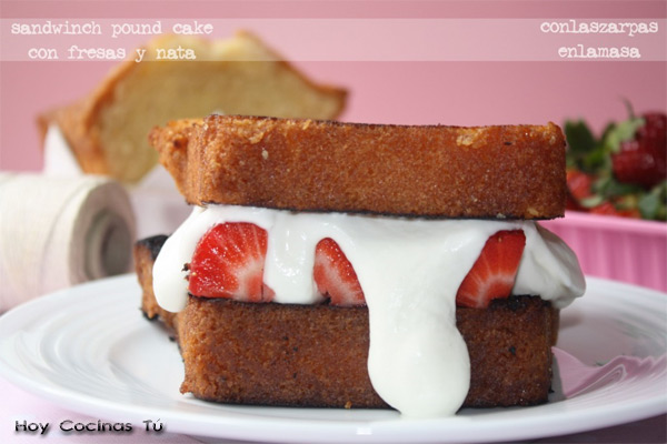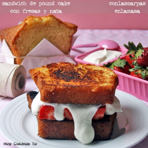 Por qué no hacer un sandwich dulce, esta es la propuesta de Paula, autora del blog Con las zarpas en la masa, un Sandwich pound cake con fresas y nata, ¿no os parece irresistible?. Ya sólo el pound cake o bizcocho cuatro cuartos es una auténtica delicia, si a esto añadimos al perfecto matrimonio que hacen fresas y nata, el resultado sólo puede ser espectacular.