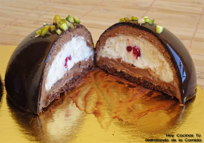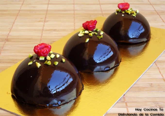 Y por supuesto, podéis tomar nota de la receta de estas Semiesferas de chocolate rellenas de mousse de chocolate, bavarois de María Luisa, una fina capa crujiente de praliné, chocolate y neules (barquillos), frambuesas y bizcocho de chocolate sin harina. Para darle un acabado perfecto, nada mejor que un glaseado brillante. ¿Quién no se dejaría seducir por un bocado tan sugerente?