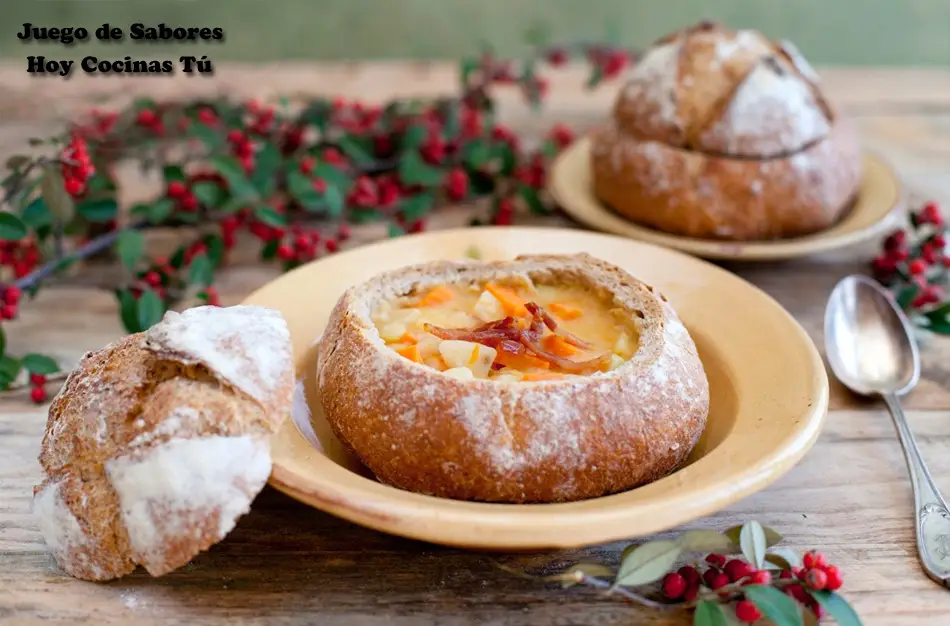 Bajo el nombre de Sopa de invierno nos encontramos con una reconfortante sopa de calabaza, patata y algunas verduras más, es la receta de las autoras del blog Juego de Sabores, que además nos dan una idea para sorprender a nuestros comensales sirviendo la sopa en un panecillo redondo, para ello basta con seleccionar un pan que tenga una corteza gruesa y crujiente, se retira la mayor parte de la miga del interior y se vierte la sopa.