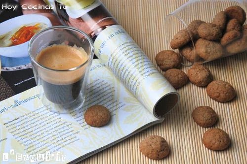 Formar bolas del tamaño de una canica, aplastarlas ligeramente con la mano y hornearlas a 160º C durante 15-20 minutos, hasta que estén doradas. Dejarlas enfriar encima de la misma bandeja.