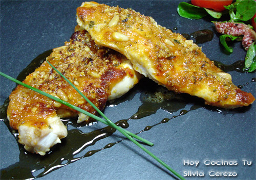Para la segunda costra, majaremos los piñones. Una vez majados agregaremos el pan rallado, el perejil, el orégano (también al gusto) y el queso rallado. Espolvorearemos la mezcla sobre la primera costra, de manera que cubra bien las pechugas.