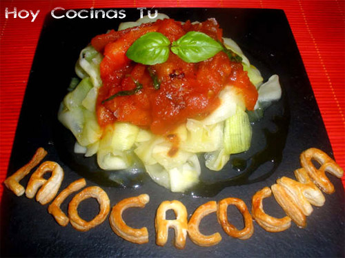 Montar en el plato que os guste una especie de volcán de los tagliatelle sobre el que espolvoreamos un poco de sal Maldon y un chorrito en hilo de aceite de oliva virgen. Luego colocaremos en el centro los gajos de tomate y la albahaca y para decorar un hilo de aceite alrededor del volcán y un par de hojitas de albahaca frescas en el centro del plato. Voilà! Ya tenemos tagliatelle, eso sí, falsos falsos. Pero ricos ricos, os lo aseguro. Si queréis podéis rallar un poco de queso tipo Parmiggiano, al gusto posibilidades dietéticas.
