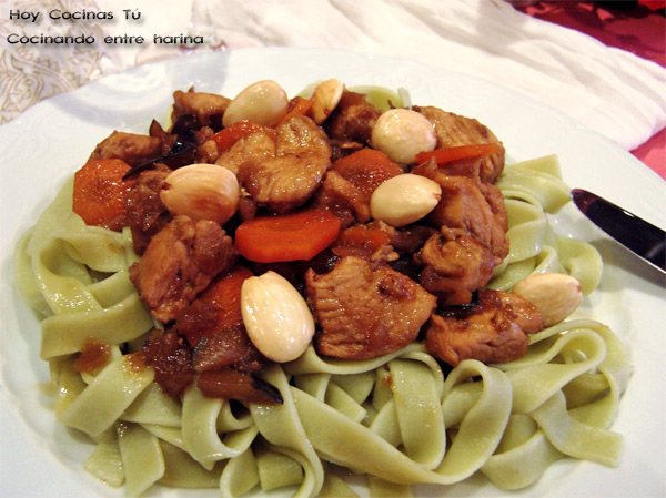 Con una ensalada fresquita como entrante y esta receta Tallarines de espinacas con pollo y almendras que comparte con nosotros en vuestra sección Hoy Cocinas Tú Malú, autora del blog ‘Cocinando entre harina’, ya tenemos el menú completo.