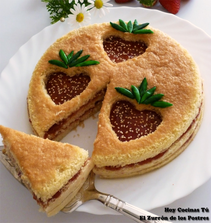 Cortamos el bizcocho en tres capas. Colocamos la primera capa de bizcocho en el plato de presentación, lo mojamos con un poco de almíbar y extendemos 100 gramos aproximadamente de la mermelada de fresa. Picamos las fresas en trozos muy pequeños y la esparcimos encima de la mermelada.