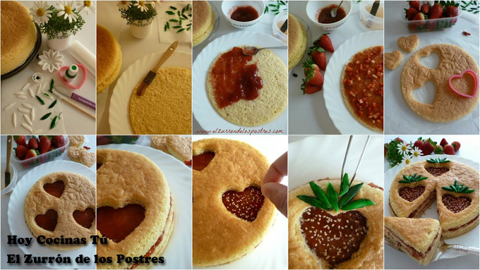 Ponemos la otra capa de bizcocho y mojamos con parte del almíbar y cubrimos con el resto de la mermelada. A la última capa le cortamos unos corazones para formar una fresa y colocamos encima de la tarta. Repartimos las semillas de sésamo en los huecos y colocamos las hojas de fondant. Llevamos a la nevera hasta el momento de servir.