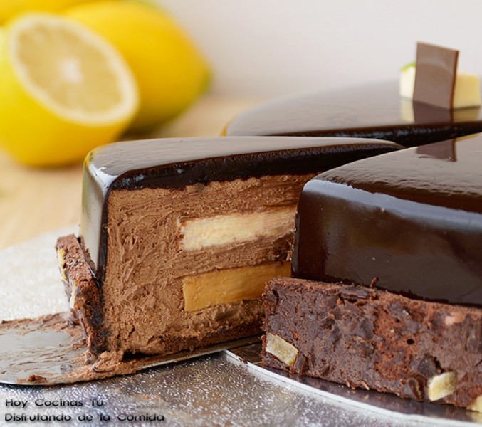 Vertemos la mousse de chocolate dentro del aro de 20 cm que preparamos anteriormente, procurando rellenar sólo hasta que quede cubierto el bizcocho que pusimos en la base, ahora sacamos los interiores del congelador y con cuidado colocamos primero el disco de toffee encima de la mousse de chocolate, de modo que quede centrado, presionamos ligeramente para que quede lo más recto posible, a continuación seguimos rellenando con más mousse de chocolate hasta que quede cubierto y colocamos el disco de crema de limón encima, de modo que quede centrado y presionamos ligeramente para que quede lo más recto posible, terminamos de rellenar con más mousse de chocolate hasta llegar arriba y alisamos con la espátula. Congelamos el conjunto para que quede todo bien unido. Con la mousse que nos sobre rellenaremos unos moldes rectangulares pequeños y también los congelamos (después los utilizaremos en la decoración).