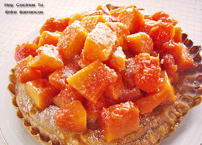 Reparte la papaya caramelizada sobre las tartaletas o el hojaldre, según lo hayas preparado, y baña con el jugo que ha desprendido de su cocción. Para terminar, espolvorea el azúcar glas.