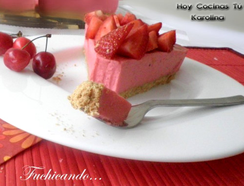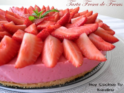Se agradecen las tartas refrescantes en esta época del año, y Karolina, autora del blog Fuchicando en mi cocina, nos propone una Tarta fresca de fresas, nos cuenta que la hace todas las semanas y que es una tarta cargada de vitaminas por su alto contenido en fruta, además es ligera porque esta hecha a base de queso fresco y yogures naturales.