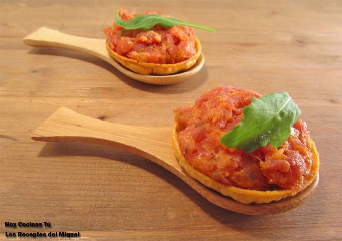 Introducir el preparado de fuet y tomate en una manga pastelera para facilitar el servicio en las tartaletas, también se puede servir sobre unas tostadas o galletas saladas.