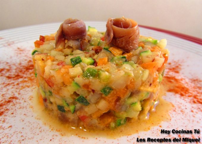 A continuación podéis tomar nota de la receta del este tartar de crudités del autor del blog Les Receptes del Miquel, quien nos propone también una sabrosa vinagreta de frutos secos y el punto salado que ofrecen las anchoas en semiconserva. Es importante que éstas sean de calidad para que además del buen punto de sal, aporten buen sabor. Si vosotros también queréis compartir vuestras recetas preferidas en la sección ‘Hoy Cocinas Tú’, esperamos que nos las enviéis por correo electrónico a info@gastronomiaycia.com.