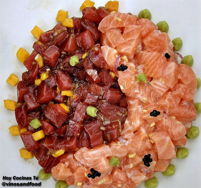 El juego visual que ofrece la combinación de colores es también un juego de sabores, comprobaréis que el tartar de atún se complementa con unos daditos de mango y aceite de sésamo, entre otros ingredientes, y tartar de salmón con jengibre y aguacate. Lo cierto es que es un plato que apuesta a ganar, tanto si se comen las dos elaboraciones por separado como si se mezclan para disfrutar de la combinación de pescados y sus condimentos, si lo probáis, nos lo confirmaréis. Esperamos que os guste.