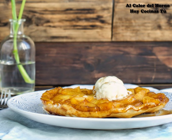 La tarta tatin es un postre clásico de la cocina francesa, creado por accidente por las hermanas Tatin, aunque hay distintas opiniones, quien piensa que caramelizaron demasiado las frutas, quien afirma pusieron la fruta en el molde antes que la masa, y también quien considera que es una tarta al revés hecha a conciencia, tan habitual cuando no había horno en las cocinas. Podéis conocer más detalles aquí. En cualquier caso, la tarta tatin es una delicia en la que se combina la masa (de hojaldre, quebrada…) con la fruta caramelizada, y hoy tenemos una Tatin de piña con helado de vainilla para caer en la tentación.