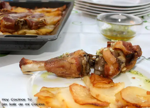 Introducir en el horno a 200º C durante unos 20-30 minutos para que se cocine el conjunto. En cuanto veamos que se ha tostado la carne un poco, le daremos la vuelta y seguiremos dorando por el otro lado. Pasado ese tiempo, abrir el horno y echarle agua abundante (o agua con limón) sin llegar a cubrir las patatas. Dejar asar durante unos minutos a 200º C (10 ó 15 minutos) para luego bajar el fuego a 160ºC hasta terminar. Conforme se va evaporando el agua hay que volver a echar calculando que la última media hora debe dejarse evaporar. Yo he llegado a tenerlo en el horno unas 3 horas y media, quedando así la carne tierna y bien separada del hueso.