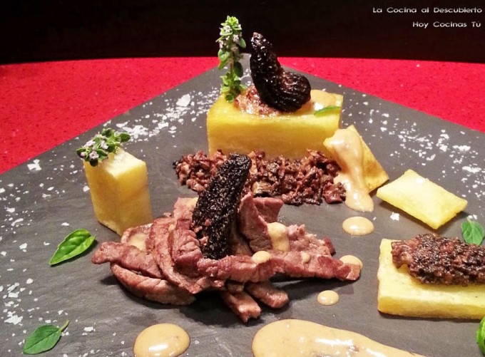 Presenta el plato como un ‘paisaje comestible’. Coloca las patatas, la ternera, la tierra de colmenillas con foie (como si fuera una tierra), las colmenillas cocidas rellenas con la salsa… puedes decorar con unas flores de tomillo limón y unas hojas de orégano.