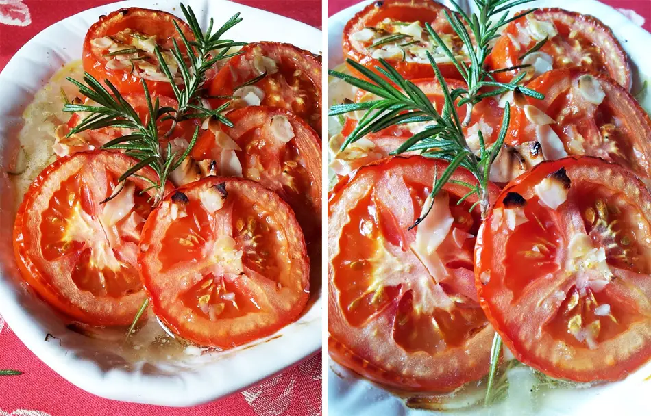 Sirve el tian de tomates recién sacado del horno. Es un entrante muy saludable, sano y ofrece un sabor muy agradable, una combinación deliciosa.