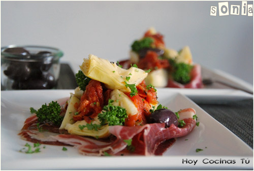 Poner dos lonchas de jamón en cada plato y en el centro la mezcla de los tomates y alcachofas.