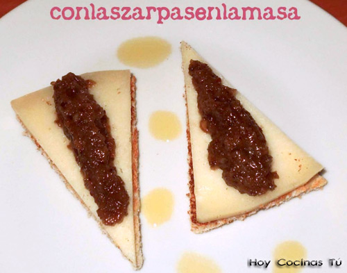 Tostamos el pan y le añadimos un chorrito de aceite virgen extra. Cubrimos con una porción de queso curado y dos cucharadas de mermelada de setas. ¡A disfrutar!