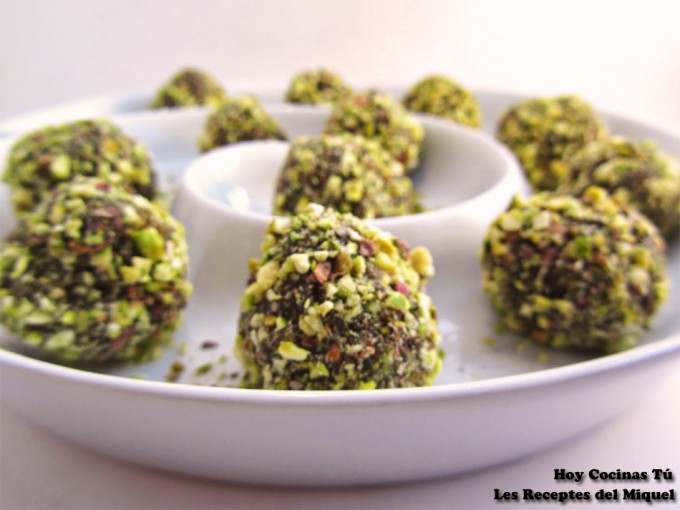 Una vez hechas las bolitas las ponemos sobre el plato con los pistachos picados, las rebozamos y listas para degustar.