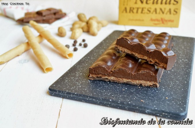 En poco más de un mes nos encontraremos en plenas fiestas navideñas, pero ya se encuentran en muchos comercios los dulces tradicionales para esas fechas. Es momento también de empezar a probar y elaborar los dulces de Navidad caseros, e inauguramos la temporada con una excelente propuesta de Roberto, autor del blog Disfrutando de la comida, que comparte con nosotros su receta de Turrón de cacahuetes, neulas y pimienta de Jamaica. Este turrón se compone de un praliné de cacahuetes con trocitos de neulas que le aportan una textura crujiente, cubierto de una ganache de chocolate aromatizada con pimienta de Jamaica. Roberto asegura que la combinación de sabores es sorprendente, no hay duda.