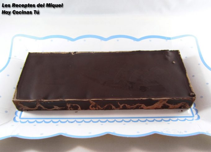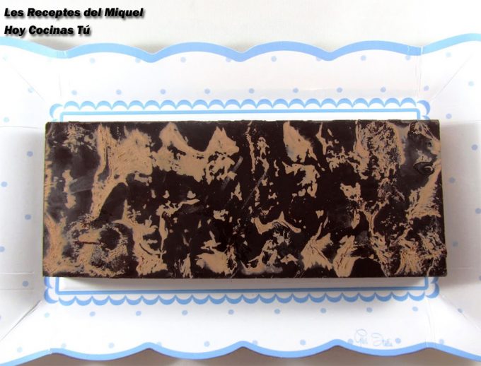 Nota: Me ha quedado la parte inferior y los laterales como amarmolado y es porque el molde era de acero inoxidable y para desmoldarlo mejor le aplique una capa de spray desmoldeante que, con el contacto con el chocolate quedo así y, realmente, mola más que la parte superior.
