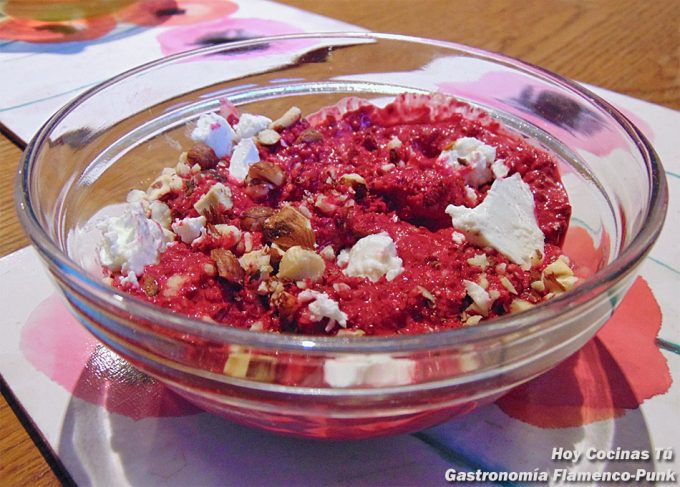 El resultado, el unte de remolacha, lo vertemos en un cuenco y lo decoramos con queso de cabra en trocitos y los frutos secos a los que previamente les habremos dado un par de golpes en el almirez.