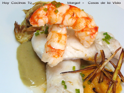 Esta suculenta receta de Margot se define con su nombre, Ventresca con langostinos al vapor sobre cama de crema de alcachofas y puerros con almohada tricolor, aunque ella ha querido bautizarla como ‘El Brillo de Dubai’.