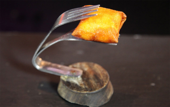 Encendemos la freidora o calentamos aceite a 180º C, y freímos el pincho huevo con patatas y bacon con los pliegues hacia abajo, cubriéndolo de aceite hasta la mitad. Pasados 10 segundos introducimos el pincho completamente y los soltamos. Dejamos que adquiera el tono dorado deseado.