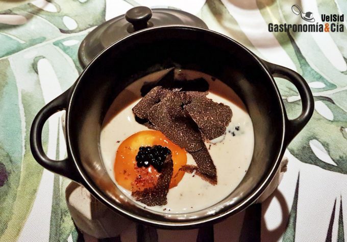 Cuando veáis los ingredientes, si os gusta la trufa negra, no tendréis duda de que el plato será una delicia. También veréis que hay poco que cocinar, pues la yema de huevo se cocina con el soplete, además se acompaña de caviar de trufa (un producto comercial), trufa laminada y, entre otras cosas, crema de boletus y trufa. Aunque esta crema también se puede comprar hecha, nuestra recomendación es que la hagáis vosotros o que adaptéis la receta, por ejemplo, podéis seguir esta receta de crema de boletus que se aromatiza con un poco de aceite de trufa. Os va a encantar, con trufa o sin ella.