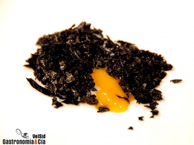 Colocar en el plato de servicio el huevo una vez pelado. Cubrir, dejando ver la yema, con las escamas de patatas fritas negras.