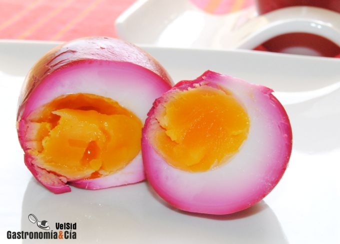 Si os gustan los escabeches más fuertes podéis añadir más cantidad de vinagre, y en cuanto a las especias, también se pueden variar, pero probad con clavo y canela que resultan unos huevos púrpura deliciosos, ideales para presentar como aperitivo, haciéndolos rellenos, decorando y acompañando una ensalada… como gustéis.