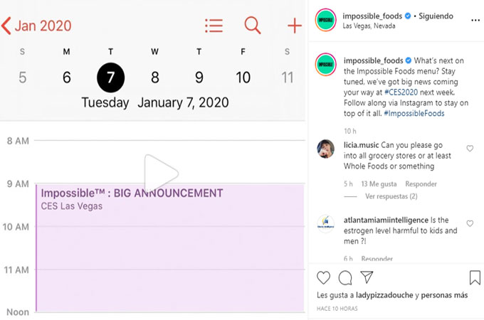 El caso es que Impossible Foods ha publicado un breve mensaje en su cuenta de Instagram invitando a los usuarios a estar atentos a la feria que se desarrollará del 7 al 10 de enero, asegurando que tiene una gran noticia y formula una pregunta que precede a esta información: ¿Qué sigue en el menú de los alimentos imposibles? Parece evidente que no va a ser otra versión de su Impossible Burger, hamburguesa considerada por la revista Time como una de las 100 Mejores Innovaciones del año 2019.