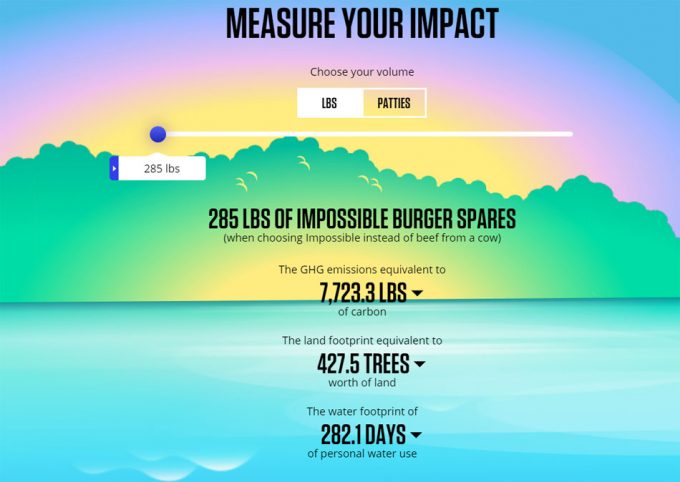 El caso es que esta calculadora ofrece información que, en teoría, ayuda a medir el progreso medioambiental al reemplazar la hamburguesa de carne por la Impossible Burger, muestra datos sobre la reducción del uso del agua, la tierra y la liberación de gases de efecto invernadero, en relación a la cantidad de hamburguesas consumidas. Se puede decir que se trata de una calculadora similar a la que proporcionan organizaciones como World Meat Free Week, organizadora de la ‘Semana Mundial sin Carne’, cuyo objetivo es concienciar a la población sobre las consecuencias de la ganadería industrial y la necesidad de reducir el consumo de carne, ya que ello permitirá obtener importantes beneficios para la salud humana y del medio ambiente.
