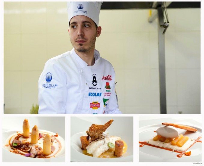 Pues bien, el primer clasificado elegido por un exigente jurado, entre los que se encontraban los cocineros Martín Berasategui, que además es presidente del Concurso Cocinero del Año, Jordi Cruz, Pedro Subijana y Álvaro Garrido, entre otros, fue Iñaki Murua (Rte. Venta Moncalvillo, Daroja de Rioja, La Rioja), que presentó un menú formado por Espárragos con pollo escabechado, Rodaballo a baja temperatura con sus pieles melosas y crujientes, acompañado de ñoquis de patata panadera, y Tarta de manzana.