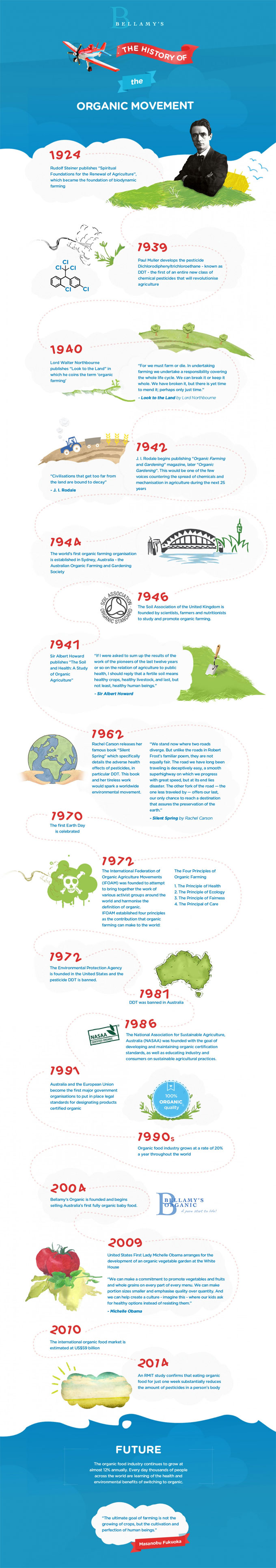 Según la infografía, la historia del movimiento de los alimentos orgánicos se empieza a labrar con la publicación en el año 1924 del libro Spiritual Foundations for the Renewal of Agriculture (Fundamentos espirituales para la renovación de la Agricultura) por el filósofo austríaco Rudolf Steiner. Esta publicación se convirtió en la base de la agricultura biodinámica (un método de agricultura ecológica que hace especial hincapié en el equilibrio integral del desarrollo de una granja o cultivo y su interrelación con el suelo, las plantas y la fauna. No se utilizan ni productos fitosanitarios ni fertilizantes artificiales, se diferencia de otros tipos de agricultura ecológica por el uso de preparados minerales y vegetales como aditivos para el suelo. Además cuenta con un calendario de siembra que se basa en el movimiento de los astros.