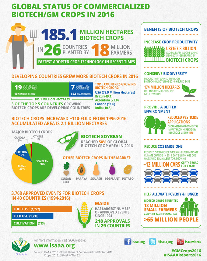 Estos cinco son el grueso de países que destinan más recursos a la producción de alimentos transgénicos. El Servicio Internacional para la Adquisición de Aplicaciones Agro-biotecnológicas destaca los beneficios económicos que todos los países que cultivan transgénicos han obtenido, la contribución que han tenido a conservar la biodiversidad, así como la reducción del impacto medioambiental gracias a que ha disminuido en un 19% el uso de herbicidas. Se destaca la reducción significativa de los gases de efecto invernadero, equivalente a retirar 12 millones de coches al año y contribuyendo a mitigar los efectos del cambio climático, la contribución que han realizado para reducir la pobreza y el hambre, al beneficiar la biotecnología a 18 millones de pequeños agricultores y a sus familias, lo que supone un total de 65 millones de personas que han mejorado sus condiciones de vida.