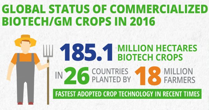 El ISAAA (Servicio Internacional para la Adquisición de Aplicaciones Agro-biotecnológicas) ha publicado el informe sobre el crecimiento de los cultivos transgénicos en el mundo 2016, en él se destaca que el año pasado se logró alcanzar un nuevo récord, llegando a cultivarse 185’1 millones de hectáreas, lo que supone un aumento de 4’1 millones de hectáreas con respecto al año 2014. Aún así, no es un crecimiento tan significativo como el que se produjo en el año 2013, cuyo incremento se cifró en 6’5 millones de hectáreas.