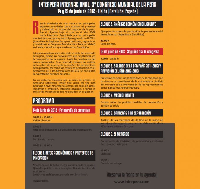 Los principales expertos y profesionales del sector agroalimentario dedicado a la pera, tienen una cita los próximos días 14 y 15 de junio de 2012, pues se celebra la quinta edición del Congreso Mundial de la Pera, Interpera. Este encuentro tendrá lugar en el Palacio de Congresos La Llotja de Lleida (Lérida, Cataluña), además de otros escenarios para la realización de visitas técnicas, por ejemplo.
