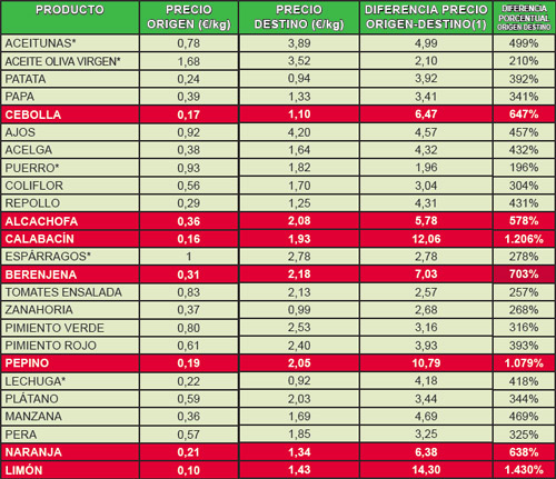 Lo mismo ocurre con las berenjenas, que en sólo un mes han incrementado al doble la diferencia entre el precio origen-destino, pasando de un 363% porcentual del mes pasado, a un 703%. Esto se ha debido también a la reducción del precio que se paga a los productores, pasando de los 0,60 euros el kilo a los 0,31 euros el kilo.