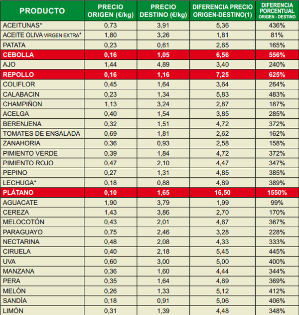 Tras los plátanos, el repollo se sitúa en segundo lugar en el ranking de los precios especulativos, en el mes de julio se cotizó en origen a 0’16 euros/kilo, un céntimo menos que en el mes de junio, en cambio los consumidores hemos pagado 12 céntimos más por kilo, situándose el precio en 1’16 euros/kilo. La diferencia porcentual se ha incrementado pasando de un 512% a un 625%, hemos pagado 7’25 veces el valor del producto en origen. El último alimento que supera la franja del 500% porcentual son las cebollas, en origen se cotizaron a 0’16 euros/kilo, 10 céntimos más que en el mes de junio, un alivio para los agricultores, tengamos presente que se estaba pagando el kilo de cebollas a 0’06 céntimos y si realizamos un histórico podremos comprobar que ha sido un producto muy castigado en el mercado (en origen).