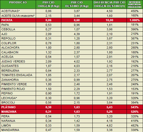 Finalmente, el último producto destacado por mostrar márgenes un tanto especulativos es la manzana, la diferencia de origen/destino se establece en un 526%, es decir, los consumidores pagamos 5’26 veces más el valor de las manzanas en origen. Los productores perciben 0’31 euros por kilo de manzanas y los consumidores pagamos 1’63 euros por kilo.