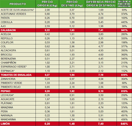 Los casos de especulación parecen ser evidentes, el margen económico de los intermediarios se incrementa, se obliga a los productores españoles a ajustarse más, es ya una tónica habitual que poco a poco reduce las producciones españolas. El tercer producto que supera la barrera del 500% son los limones, el índice porcentual se establece en un 640%, a pesar de ello, se ha mejorado levemente el precio que se ha pagado a los productores pasando de 0’18 a 0’20 céntimos en el mes de marzo, los consumidores en cambio hemos seguido pagando el mismo precio, 1’48 euros el kilo de limones. Finalmente, el último producto a destacar son los tomates de ensalada, los consumidores pagamos 7’19 veces su valor en origen, los productores perciben 0’27 euros por kilo de tomates (10 céntimos menos que en el mes de febrero) y los consumidores pagamos 1’94 euros/kilo, el mismo precio que en el mes de febrero. El índice porcentual se ha establecido en un 619%, en esta ocasión tampoco se ha trasladado la reducción de precios a los consumidores.