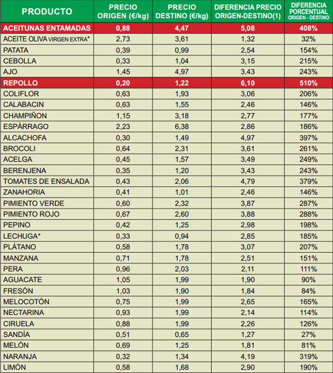Sólo dos productos aparecen señalados en rojo por su diferencia de precio en origen-destino, el primero es el repollo, en origen el precio se ha mantenido e incluso se ha incrementado en un céntimo, pasando de 0’19 euros a 0’20 euros el kilo, en cambio los consumidores hemos tenido que pagar 16 céntimos más por kilo, estableciéndose el precio en 1’22 euros. Este es uno de los pocos casos en los que la fluctuación afecta únicamente al consumidor, como sabemos la tónica habitual es la bajada de precio en origen y la subida del precio del producto en destino. La diferencia porcentual de precio en el repollo se estableció en un 510%, por lo que los consumidores hemos pagado 6’10 veces el valor del producto en origen.